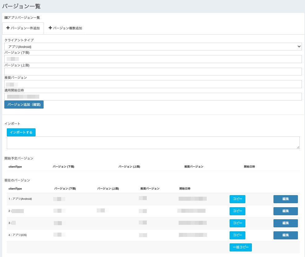 そういったケースへの配慮として、強制バージョン・推奨バージョンの2種類の状態を管理ツールで設定し、順次最新のアプリバージョンが行き渡るようにしています。